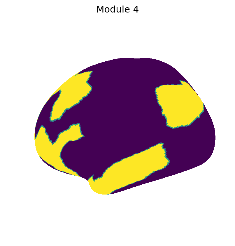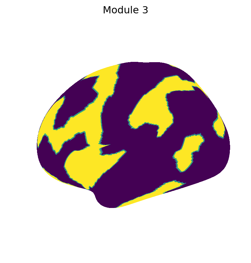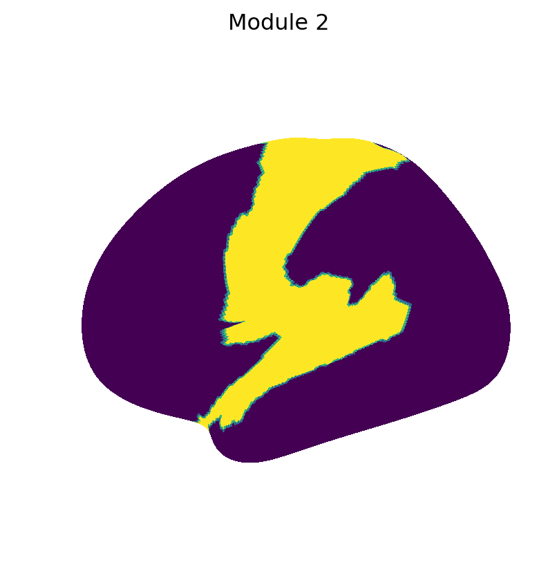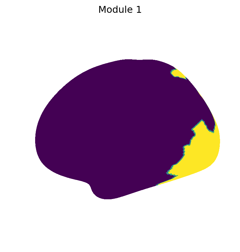 for i inrange(M.max()+1): fig_surf(1.0* (M == i), f"Module {i+1}", "viridis")
